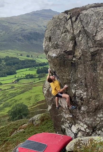 Callum Amos has developed a really great, and pretty obvious – how did we miss it! – boulder in the Langdale Valley. The block sits below Stickle Bar Crag, towards the head of the valley, and hosts around 10 problems from 4+ to 8A. Many of the lines have a highball feel, with Beneath the Remains (7B) – and its lower pit start (7B+) – Mr. Stickle (8A) and Brenda’s Baby (7A+) being three of the stand out lines.